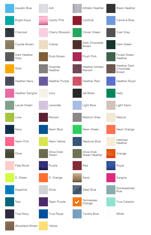 | Apparel Color | Aquatic Blue, Ash, Athletic Heather, Black, Black Heather, Candy Pink, Carolina Blue, Charcoal, Clover Green, Dark Green, Dark Grey Heather, Gold, Graphite Heather, Heather Navy, Heather Purple, Heather Red, Heather Royal, Kelly Green, Light Blue, Lime, Maroon, Navy, Oatmeal Heather, Purple, Red, Royal Blue, Sangria, Steel Blue, Teal, True Navy, True Royal, White, yellow, Bright Aqua, Cardinal, Cherry Blossom, Coal Grey, Coyote Brown, Creme, Dark Chocolate Brown, Duck Brown, Flush Pink, Forest Green Heather, Heather Athletic Maroon, Heather Dark Chocolate Brown, Heather Sangria, Ivory, Laurel Green, Lavender, Light Sand, Medium Grey, Natural, Neon Blue, Neon Green, Neon Orange, Neon Pink, Neon Yellow, Neptune Blue, Olive, olive Dab Green, Olive Drab Green Heather, Orange, Pale Blush, Safety Green, Safety Orange, Sand, Sapphire, Silver, Stonewashed Blue, Team Purple, Tennessee Orange, True Celadon, Tundra Blue, Woodland Brown |